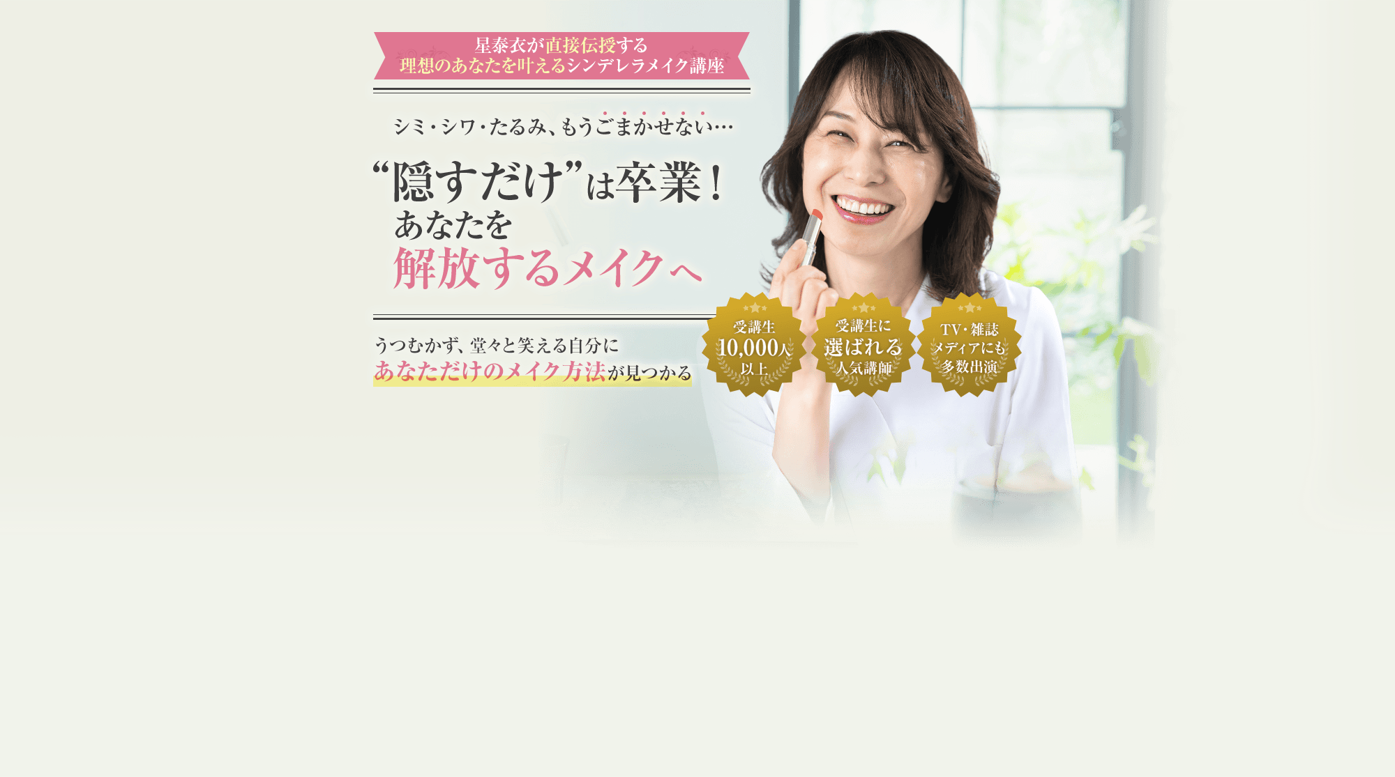「もしかして何か変われるかも! 」と体験会に参加しましたが、星先生はあっという間に、長い間悩みだったシミ・そばかすを隠すメイクを施してくれました。